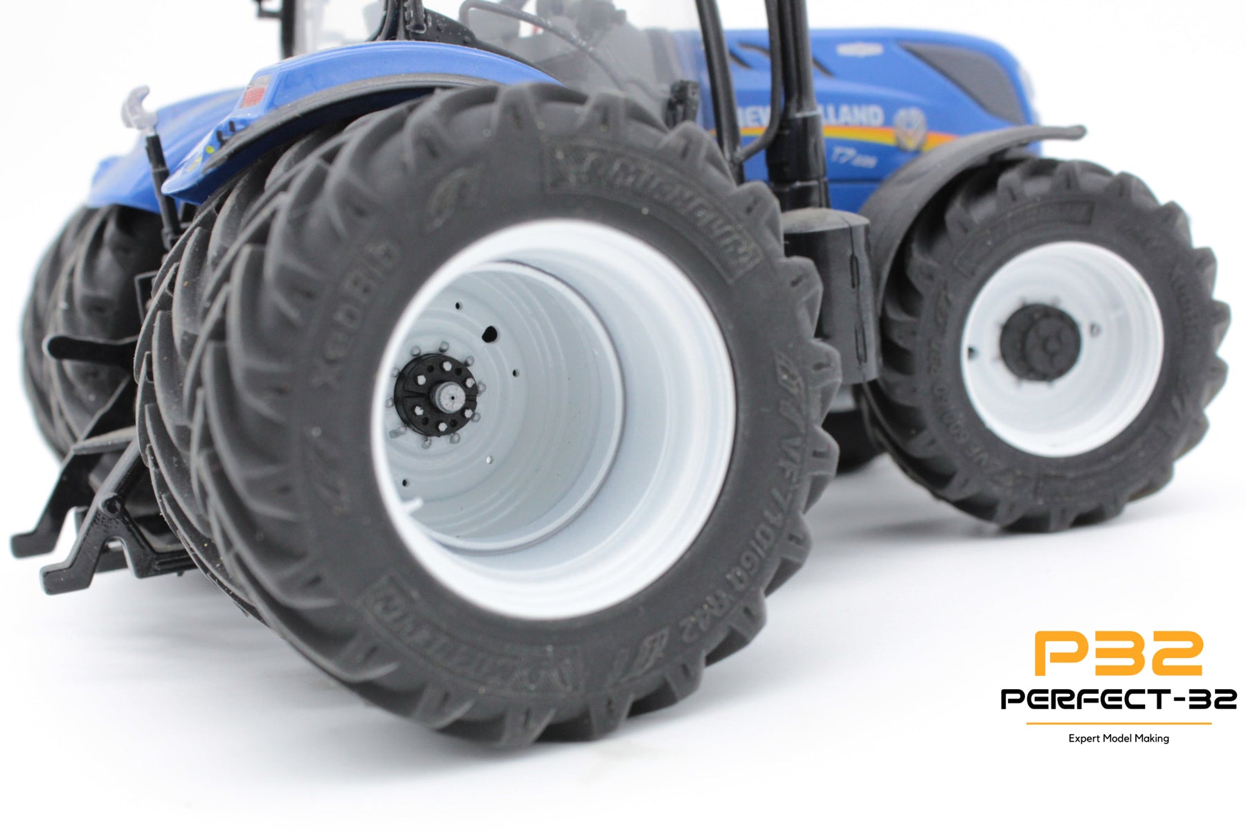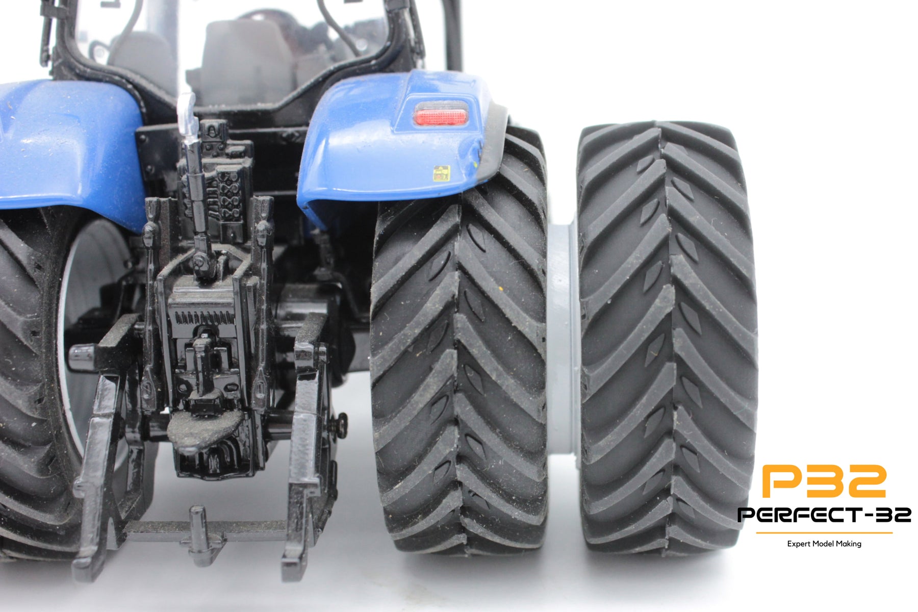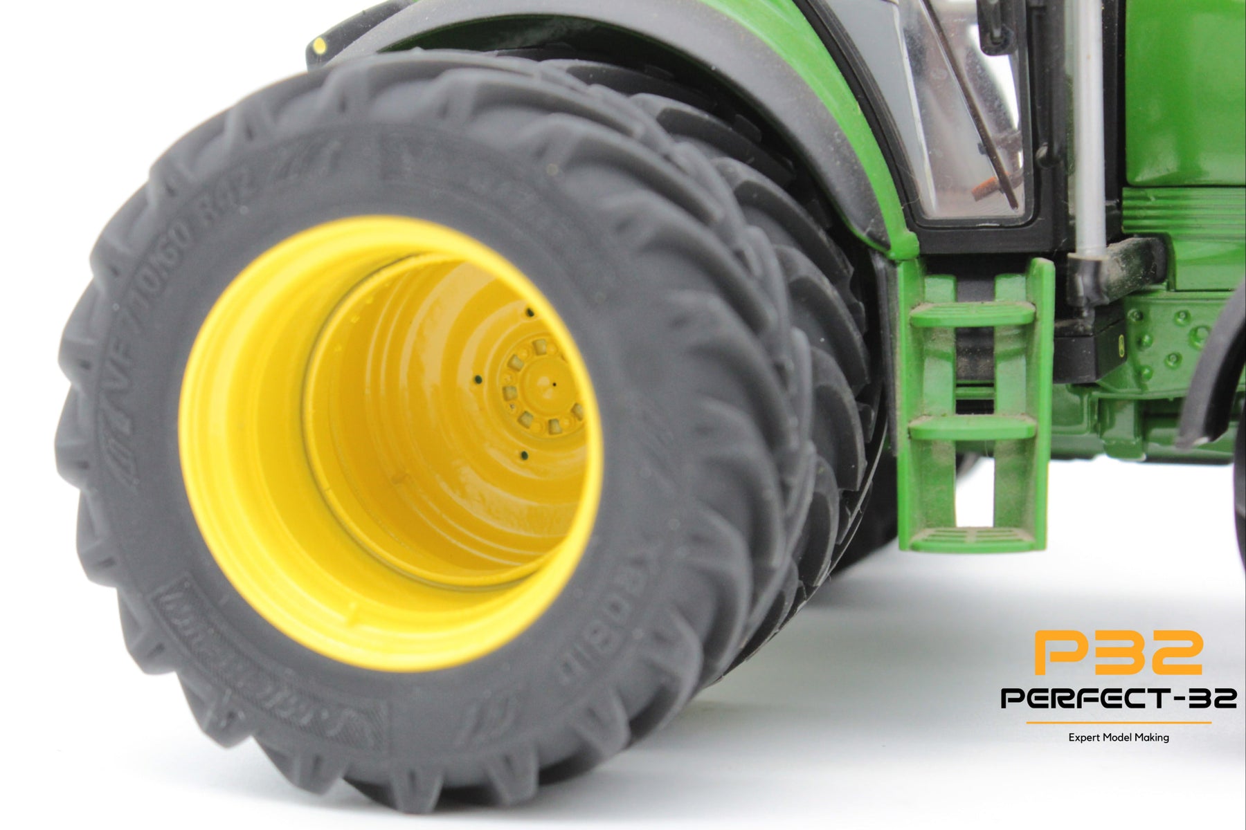 Close-up of a tractor with large wheels on a white background