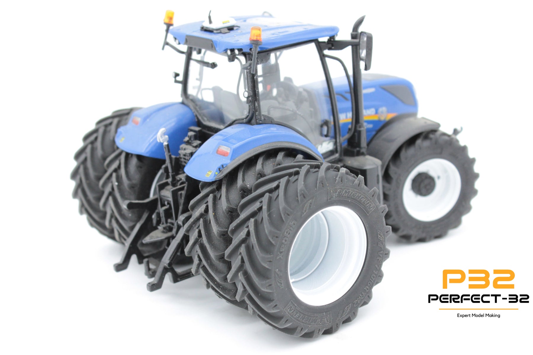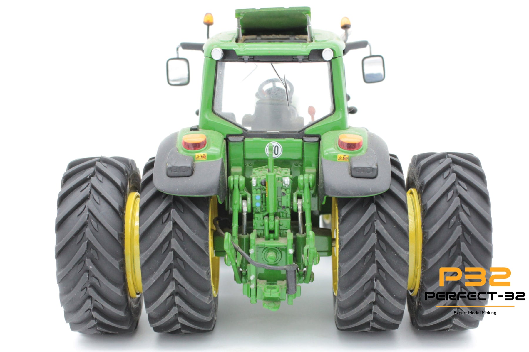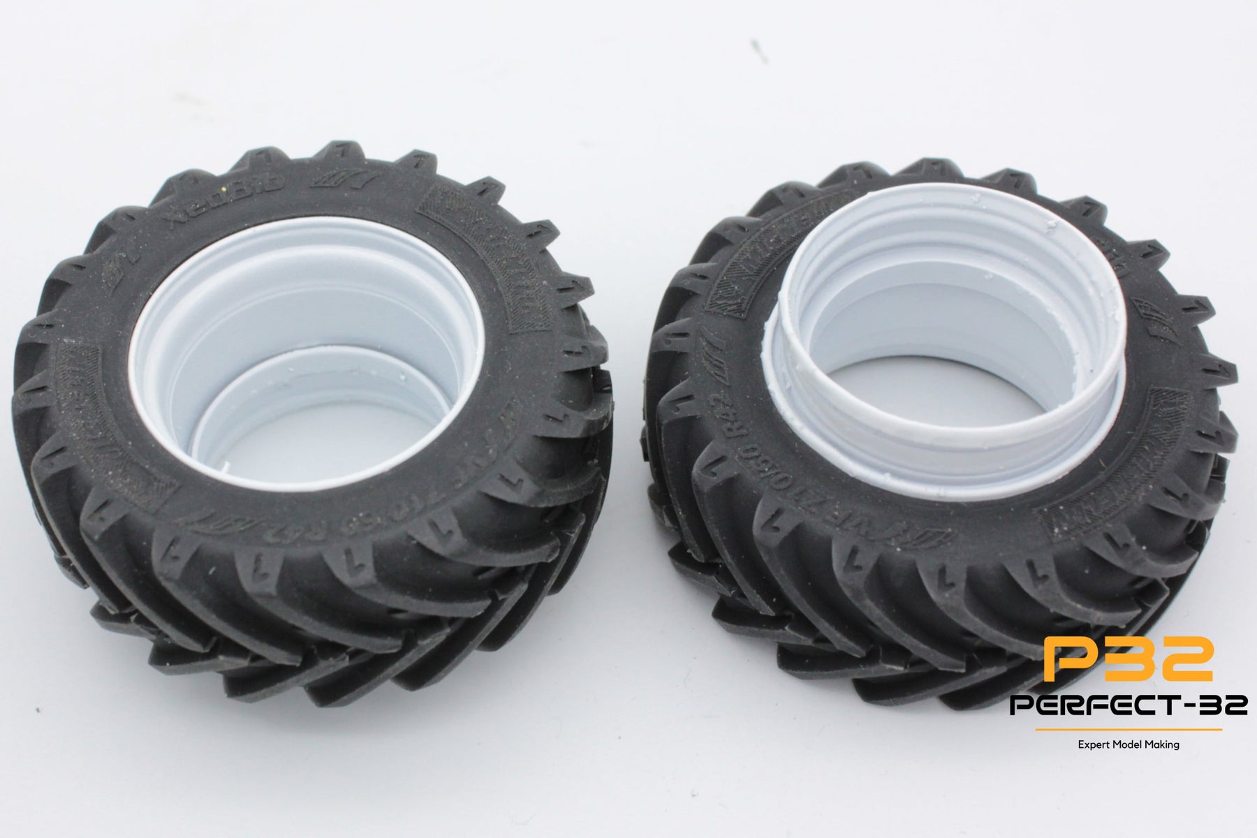 Close-up of a tractor with large wheels on a white background