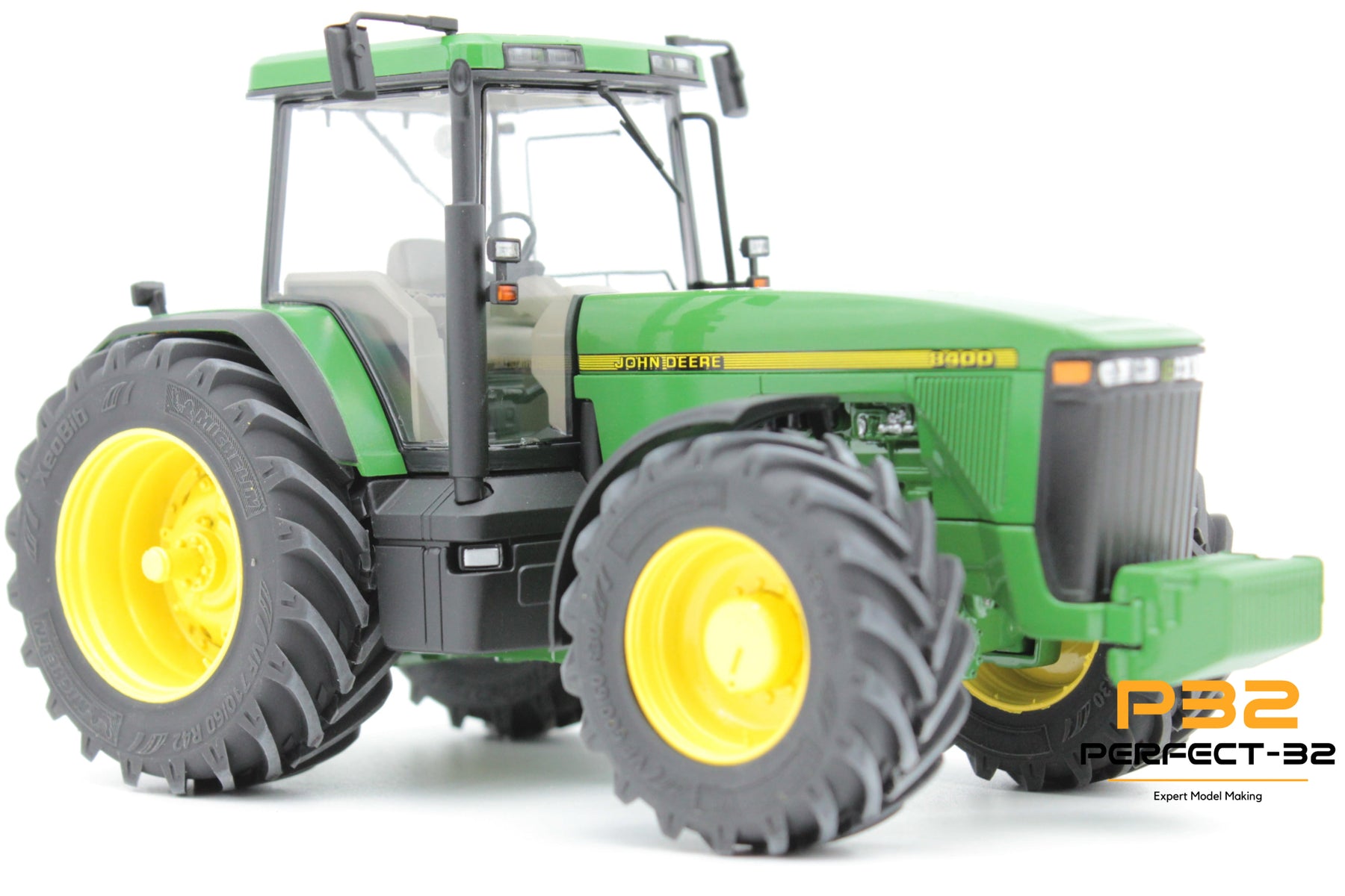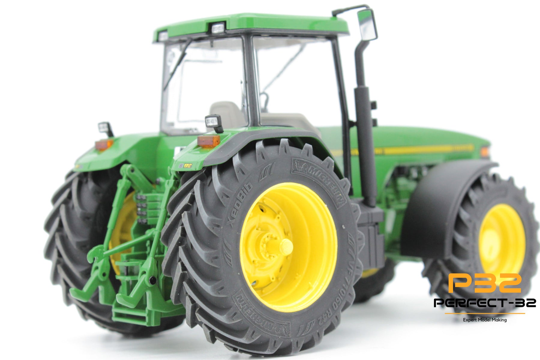 Model tractor with green body and yellow wheels on a white background