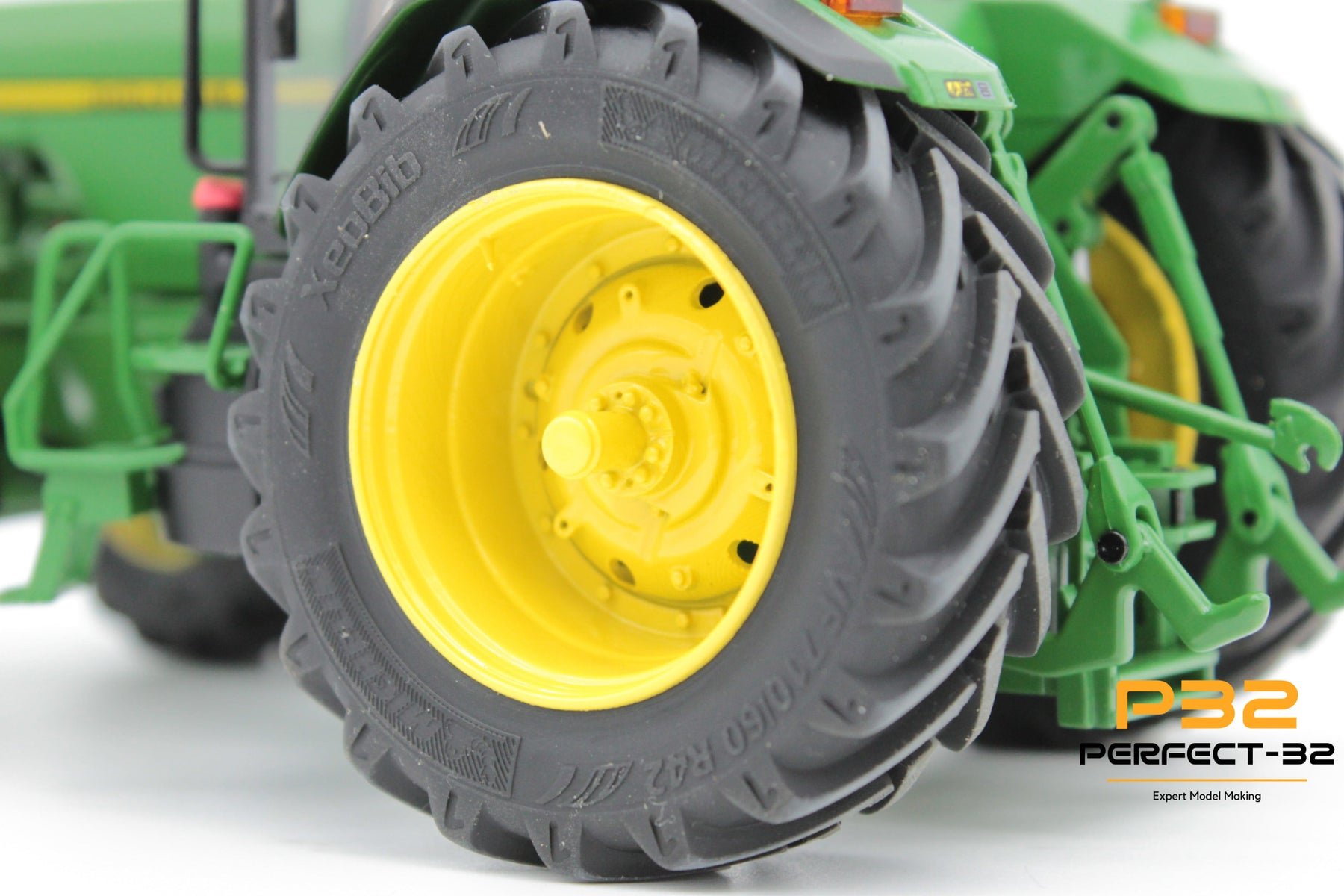 Close-up of a green tractor with a large black tire and yellow rim on a white background