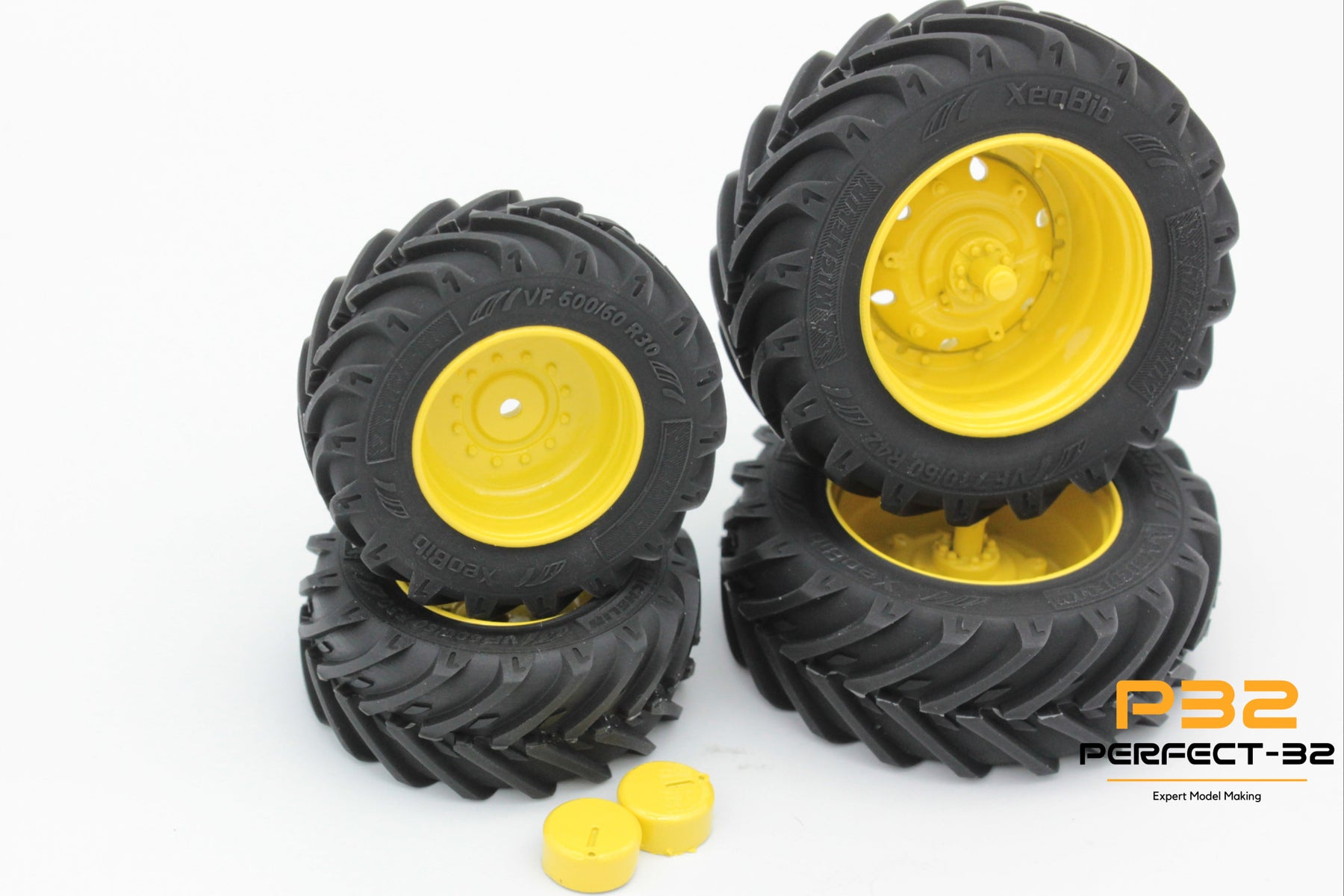 Four black and yellow off-road wheels on a white background